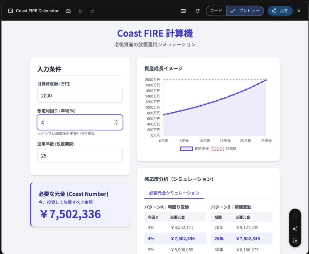 自分の年齢や資産額で細かく計算したいなら、AIにこの文章をコピペするだけで、専用アプリが作れるらしいよ。