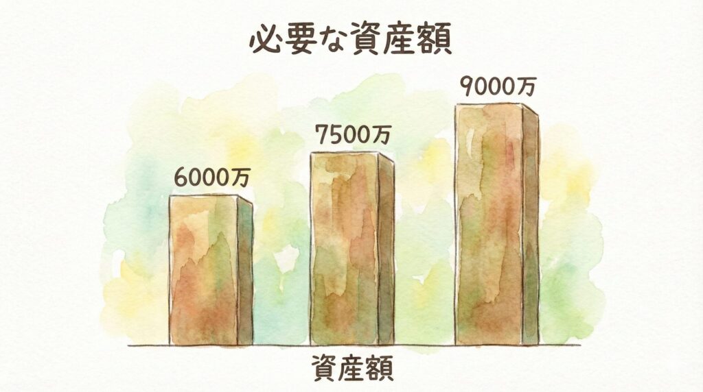 • 月30万円の場合:年間360万円 × 25 = 9000万円