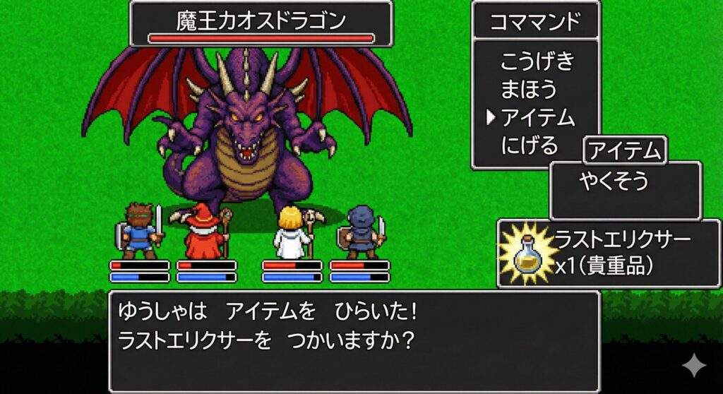 ゲームの中に「ラストエリクサー」という貴重な全回復アイテムがあります。